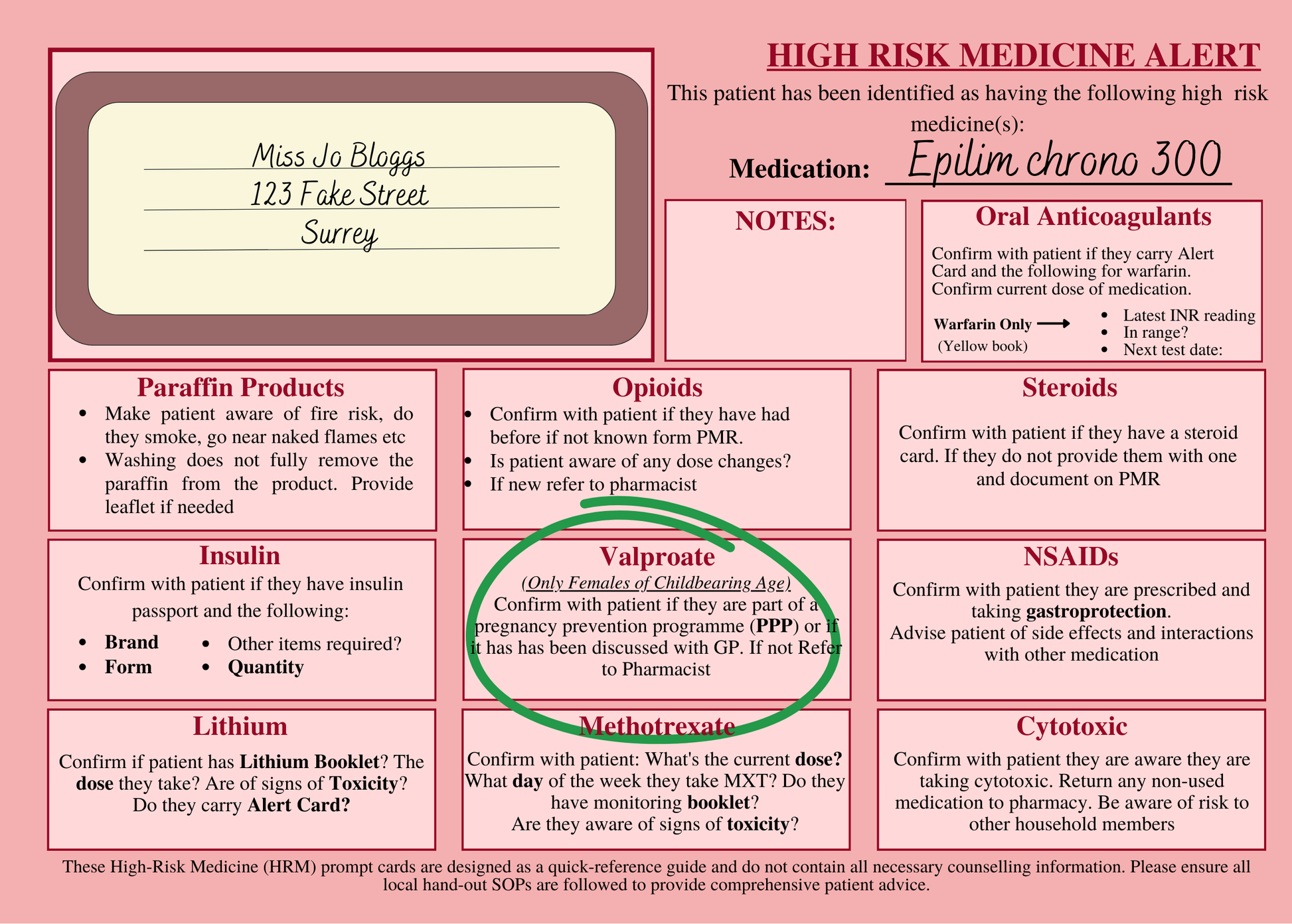 These High-Risk Medicine (HRM) prompt cards are designed as a quick-reference guide and do not contain all necessary counselling information. Please ensure all local hand-out SOPs are followed to provide comprehensive patient advice.